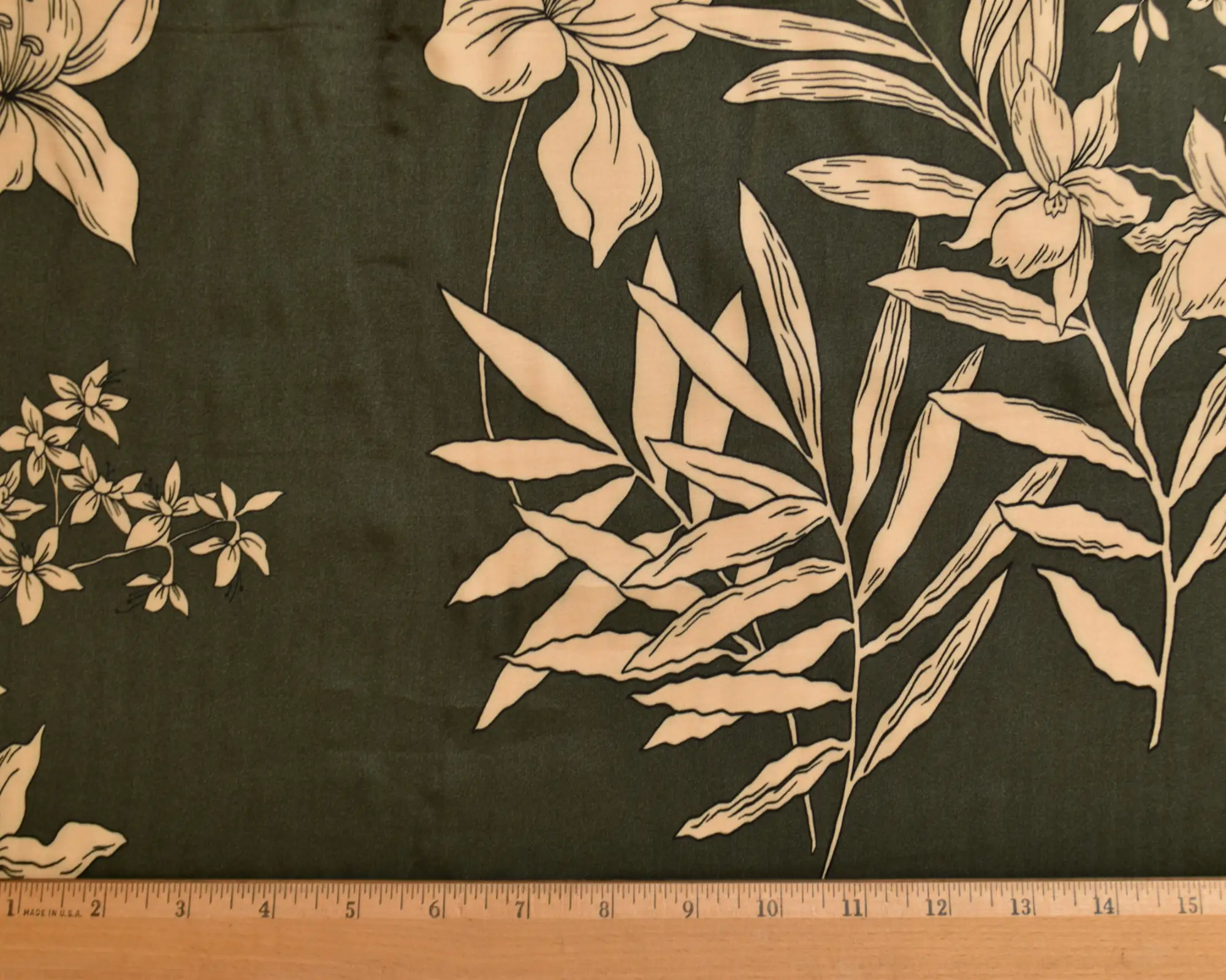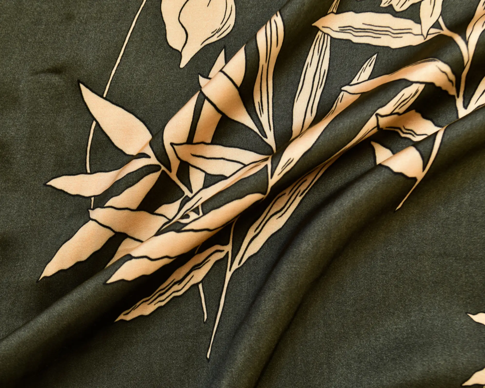 Rayon Charmeuse – Olive Green with Tan Botanical Print